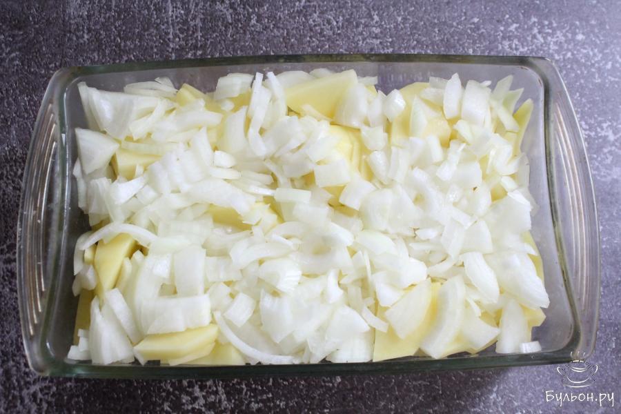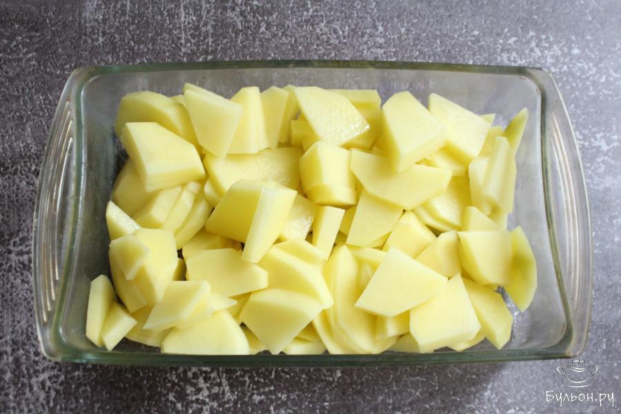 2. Овощи почистить и промыть. Картошку нарезать тонкими полукружочками. В форму для запекания вылить масло, выложить картофель.
