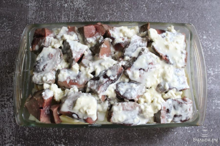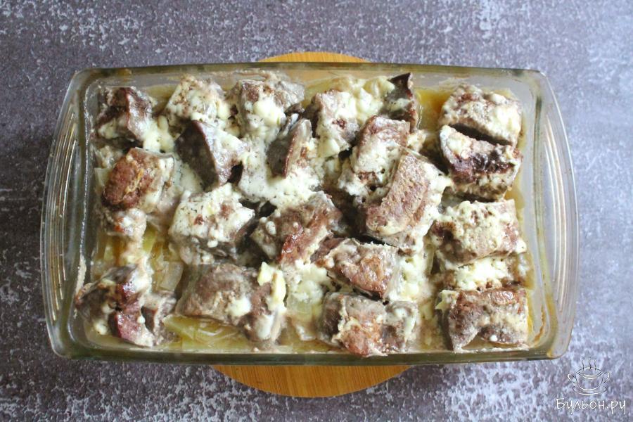 5. Печень нарезать крупными кусочками и выложить следующим слоем. Поверх печени равномерно слоем выложить сметанную заливку.