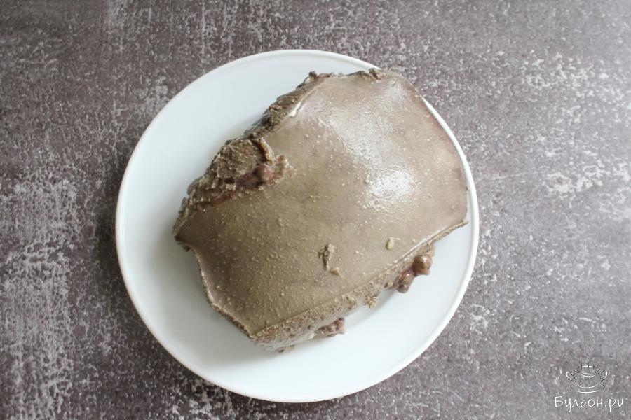 1. Говяжью печень промыть и сварить в кипящей воде 15 минут. Печень остудить, почистить от пленок и прожилок.