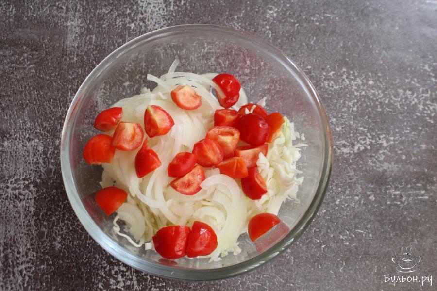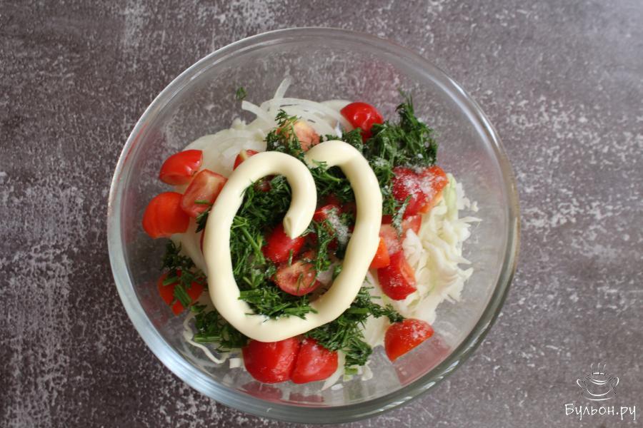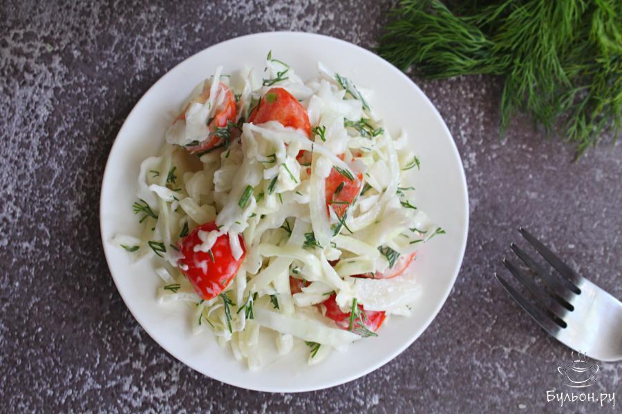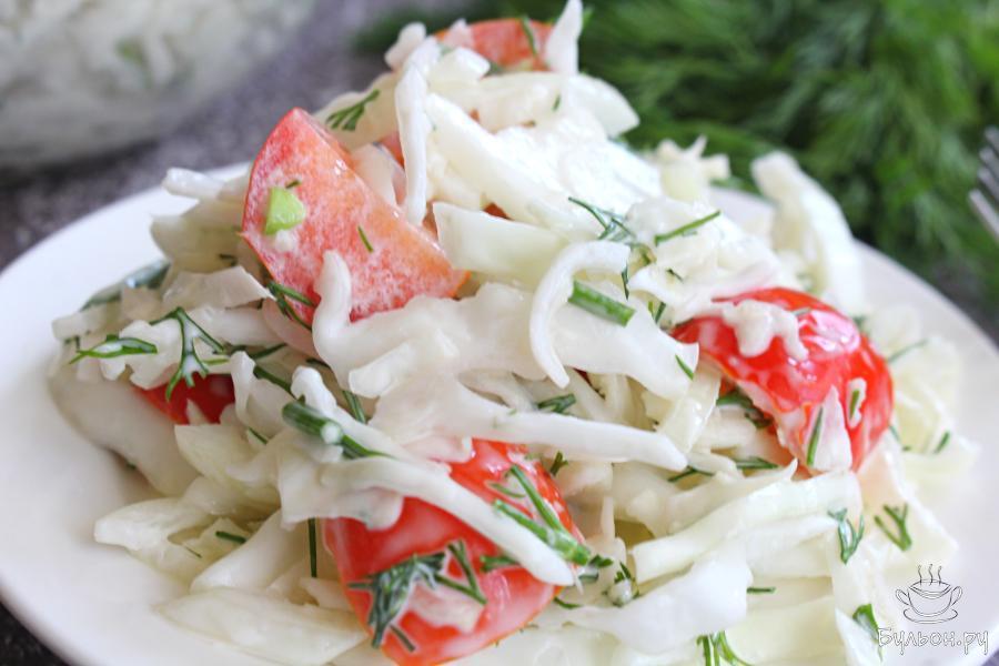 Салат из свежей капусты с луком, хреном и помидорами готовится за считанные минуты. Такой салат получается бодрящий, легкий, хрустящий и сочный. Этот салат можно заправить сметаной или даже растительным маслом, если вы не хотите добавлять майонез. Помидоры для приготовления выбирайте небольшие, плотные и сладкие. Если помидоры крупные, то можно нарезать их не дольками, а полукружочками. Зелень для приготовления салата можно взять любую, которую вы предпочитаете.
