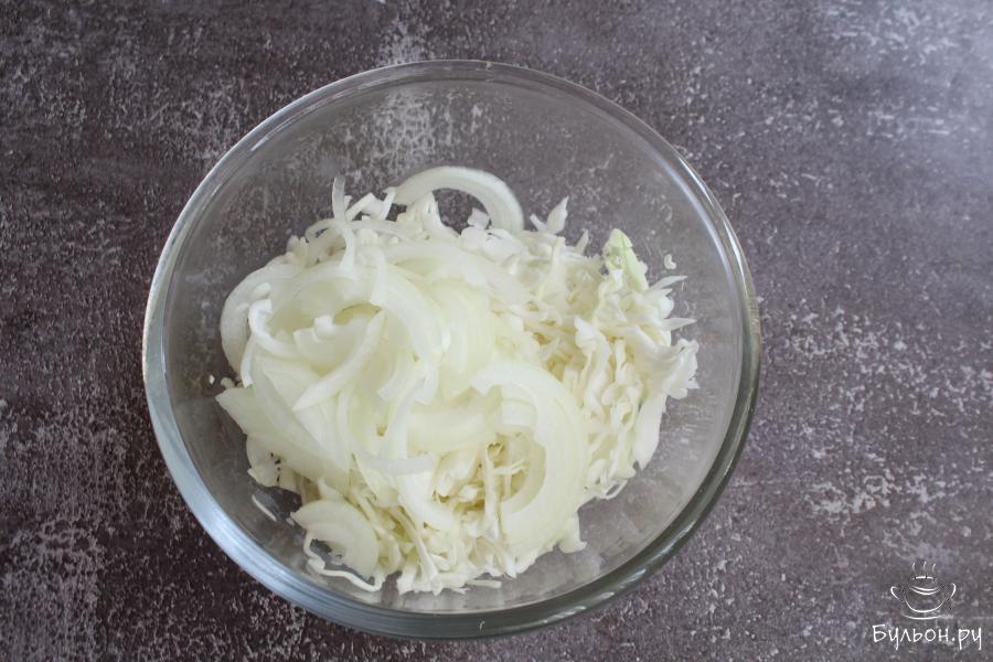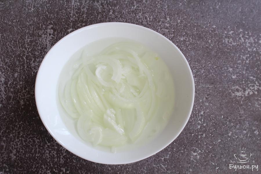 1. Лук и корень хрена почистить, овощи и зелень промыть. Лук очень тонко нашинковать ножом и залить водой со столовым уксусом. Оставить лук на 10 минут.