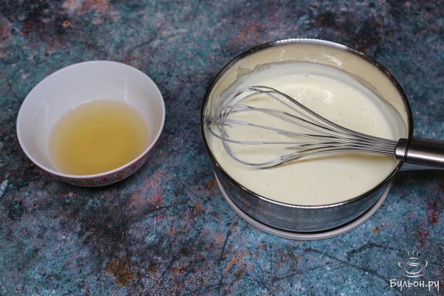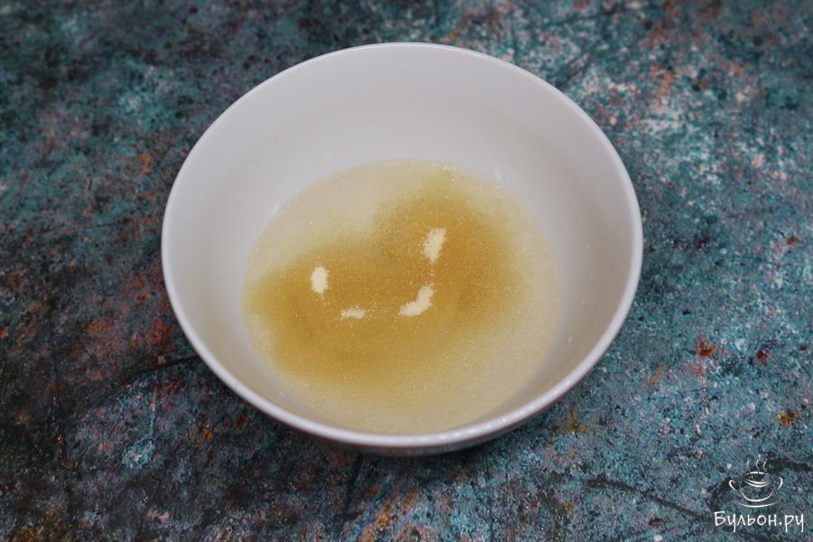 1. В миску влейте фильтрованную воду. Всыпьте быстродействующий желатин. Отставьте в сторону на 5 минут, пусть набухает. После, поставьте в другую чашу с кипятком и перемешайте венчиком, чтобы желатин полностью растворился.