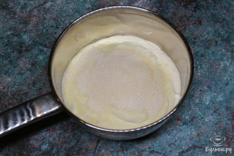 2. В ковш влейте 35% сливки, добавьте сахар и ванильный сахар. Поставьте на плиту. Прогрейте сливки на медленном огне, помешивая содержимое ковшика до момента, как растворится сахар. Немного остудите массу.