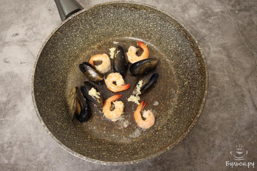 4. В сковородку выложите 10 грамм сливочного масла, растопите его. Выложите креветки и мидии, обжаривайте их на среднем огне, постоянно помешивая, в течение 2 минут. Добавьте в сковороду измельченный чеснок. Перемешайте и готовьте еще пару минут.