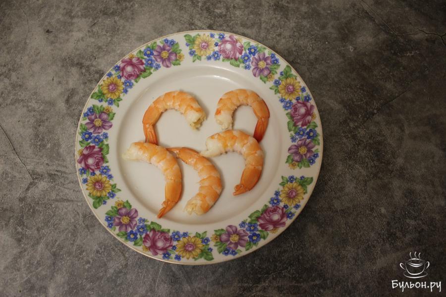 2. У заранее размороженных креветок удалите головы, очистите их от панцирей, я хвостики оставила, но вы их тоже можете удалить.