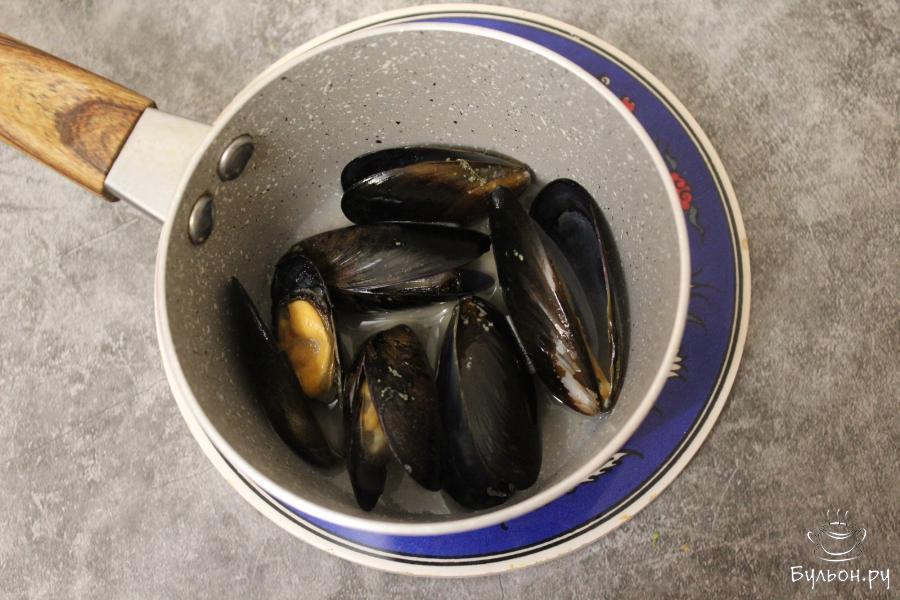 3. Мидии тщательно вымойте, так как на поверхности раковин находятся различные загрязнения, например: тина, песок, наросты и т. д. Переложите в ковшик, влейте немного воды, закройте крышкой и дайте створкам открыться.