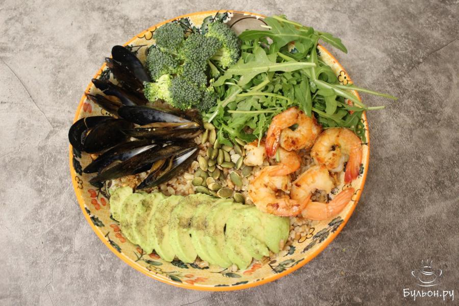5. В миску выложите готовую полбу, разровняйте. Поверх выложите креветки, мидии, половинку авокадо (нарезанного ломтиками), рукколу, соцветия брокколи, тыквенные семечки. На авокадо и рукколу полейте оливковое масло. Авокадо подсолите и немного поперчите.