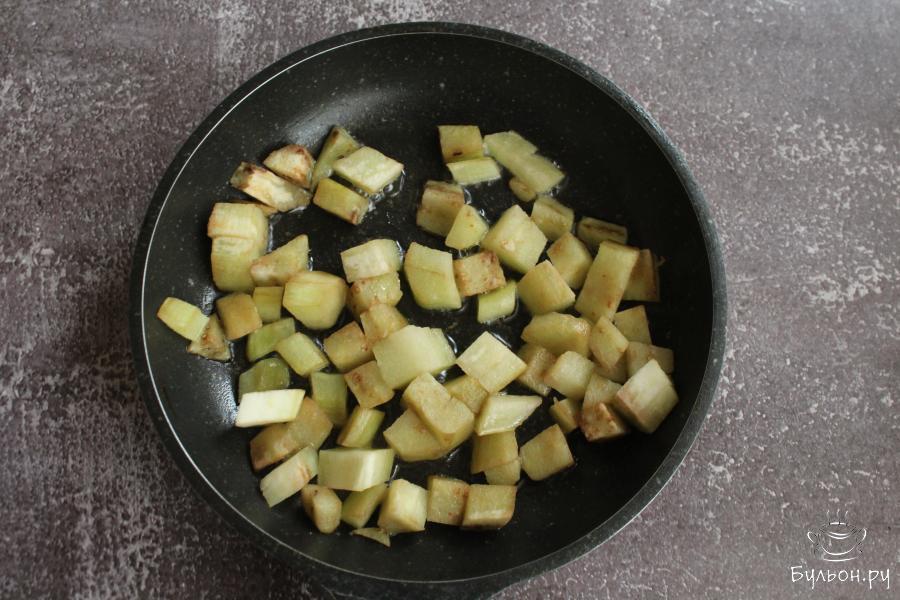 1. Баклажаны почистить, нарезать небольшими кубиками. На сковороде разогреть масло и обжарить баклажаны 3-4 минуты.