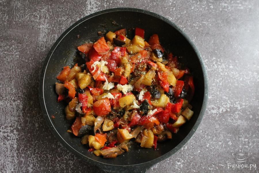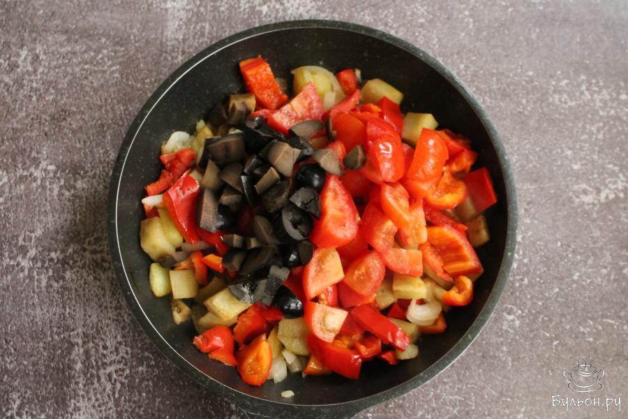 3. Помидоры промыть. Нарезать помидоры и черные оливки мелкими кубиками, выложить на сковороду, перемешать и тушить закуску под крышкой, 10 минут.