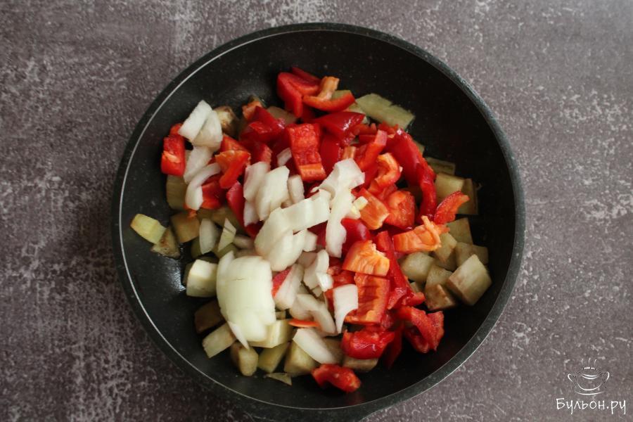 2. Лук и перцы почистить, промыть нарезать мелкими кубиками. Выложить овощи на сковороду и жарить все вместе 10 минут, помешивать.