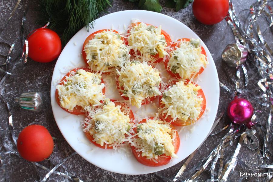 Новогодняя сырная закуска на свежих помидорах отлично подойдет, как для праздничного, так и для повседневного стола. Готовится такая закуска за считанные минуты и получается она сочная, насыщенная, легкая и вкусная. Такие помидорки исчезают со стола очень быстро. Эта красивая закуска украсит стол. Помидоры для приготовления выбирайте мясистые, плотные, сладкие и не водянистые. Сыр для начинки можно использовать любой, который вы любите, подойдет даже качественный плавленый сырок.