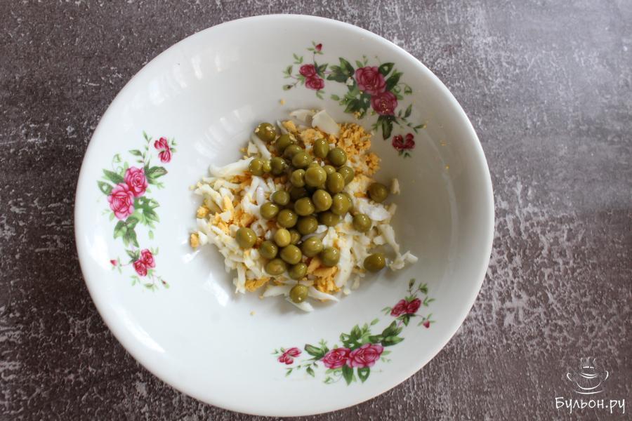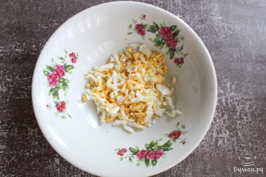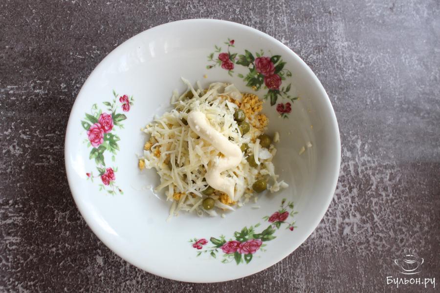3. Твердый сыр натереть через крупную терку, добавить в начинку. Добавить майонез, посолить и перемешать.