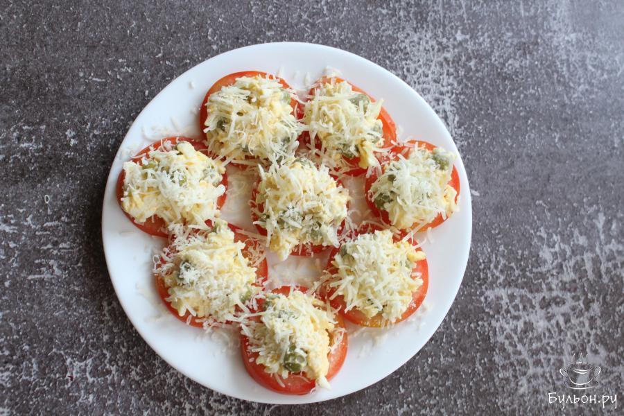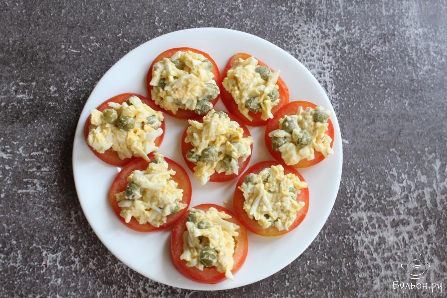 4. Помидоры промыть, обсушить и нарезать не сильно тонкими кружочками. Выложить помидоры на тарелку, посолить по вкусу.