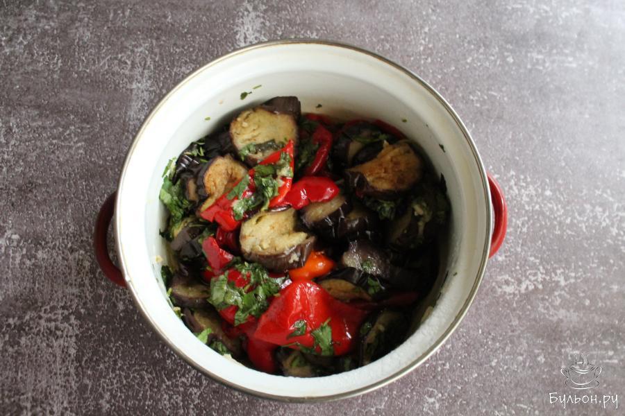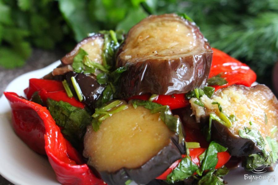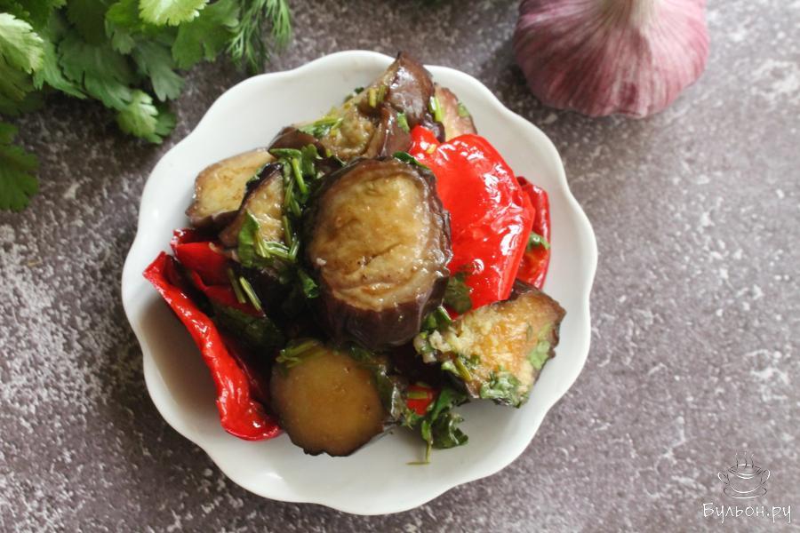 Закуска из жареных баклажанов и сладких перцев порадует вас своим ароматом, вкусом и ярким цветом. Такая закуска получается легкой, сочной, аппетитной, с остринкой и очень душистой. Перцы для приготовления нужны небольшого размера, чтобы их можно было сильно не мельчить, а просто разрезать пополам. Зелень и чеснок можно добавить больше или меньше, это по вашему вкусу. Закуска должна постоять в холодильнике, чтобы немного промариновалась и пропиталась ароматами.