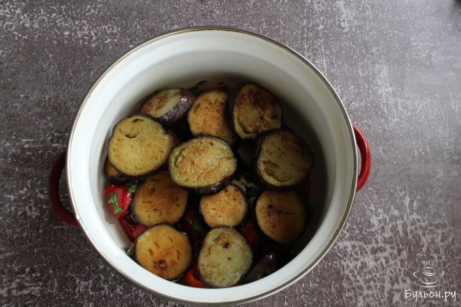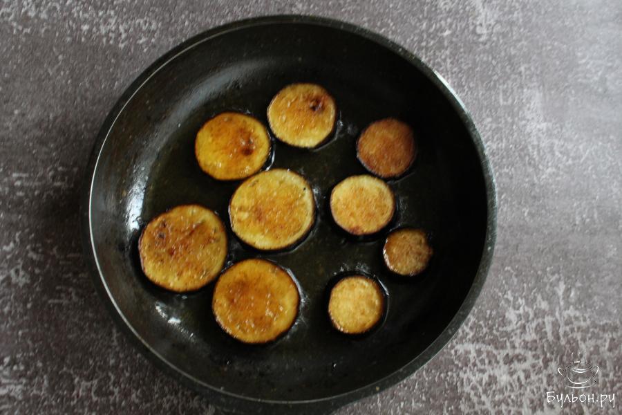 3. Баклажаны промыть, обсушить, нарезать нетонкими кружочками. Обжарить баклажаны на том же масле с двух сторон до румяного цвета.
