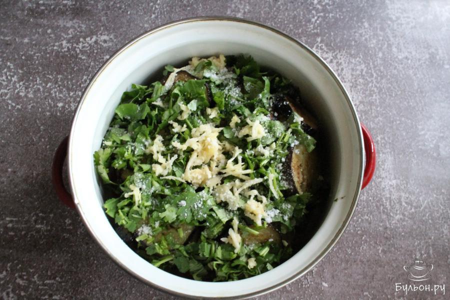 2. Выложить перцы в глубокую посуду. Кинзу мелко нарезать, очищенный чеснок продавить через пресс. Выложить половину зелени с чесноком на перцы. Посолить.