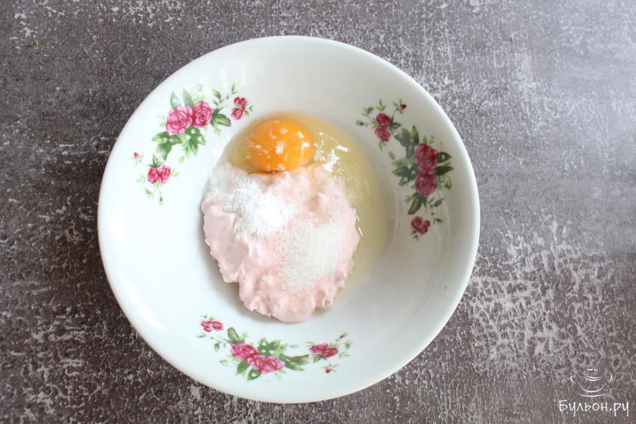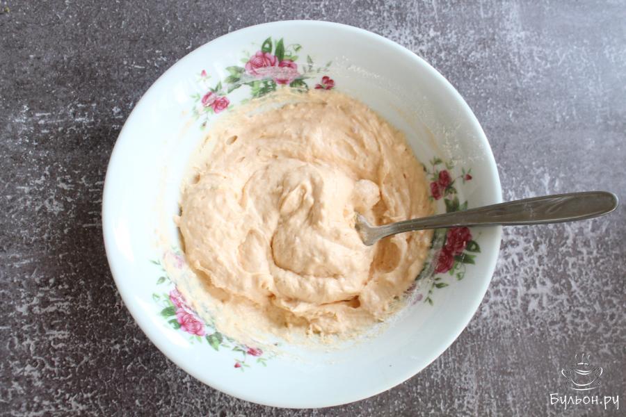 2. Добавить в чашку муку и хорошо перемешать. Муки может уйти немного больше или меньше, тесто должно быть средней консистенции.