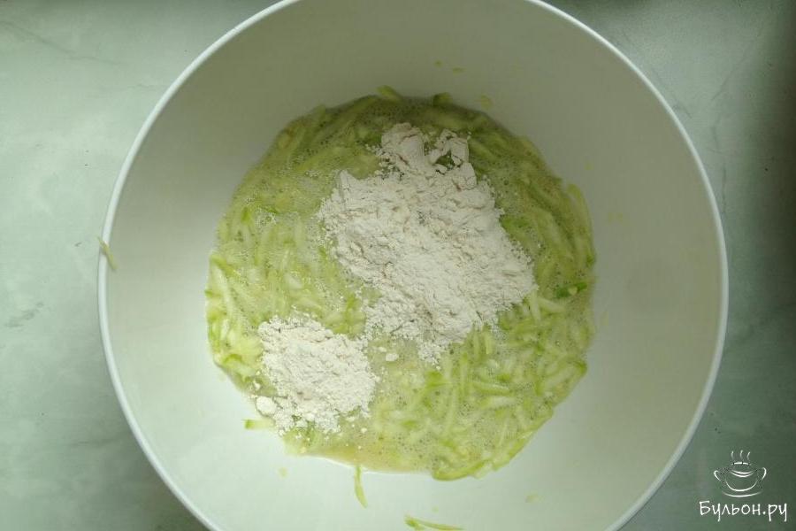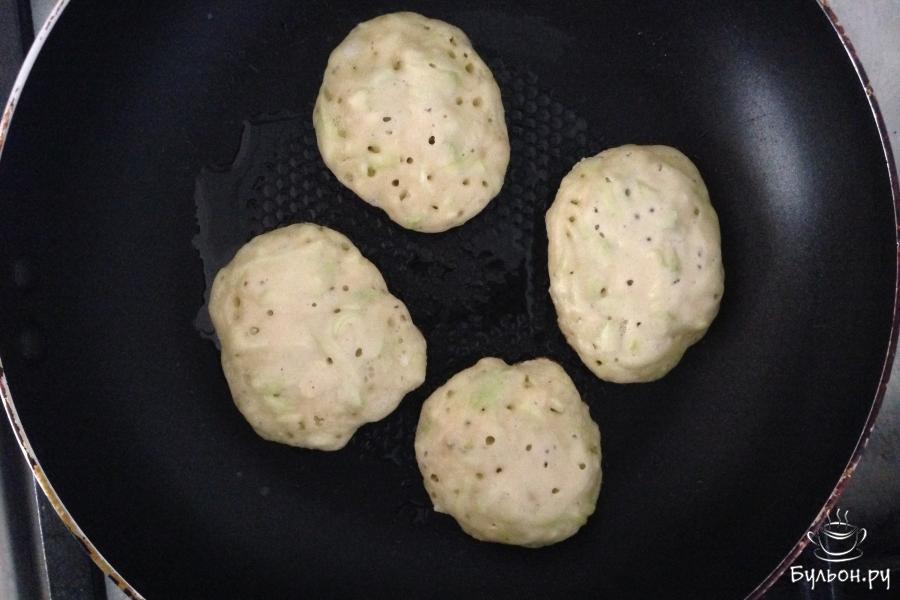 6. Сковороду смазать рафинированным маслом. Разогреть. Кабачковую смесь выкладывать ложкой. Обжаривать с двух сторон на среднем огне до готовности. Следующие партии жарить без добавления масла.