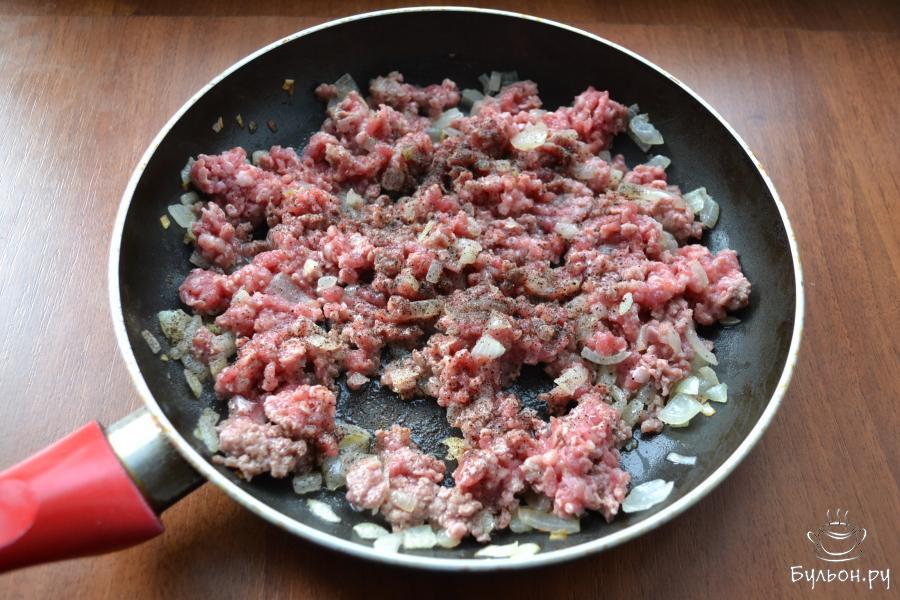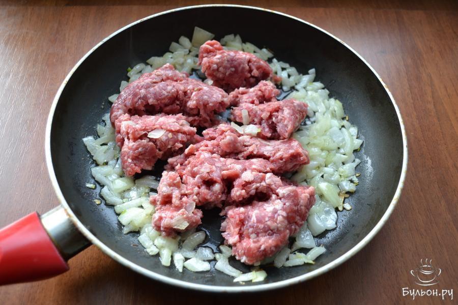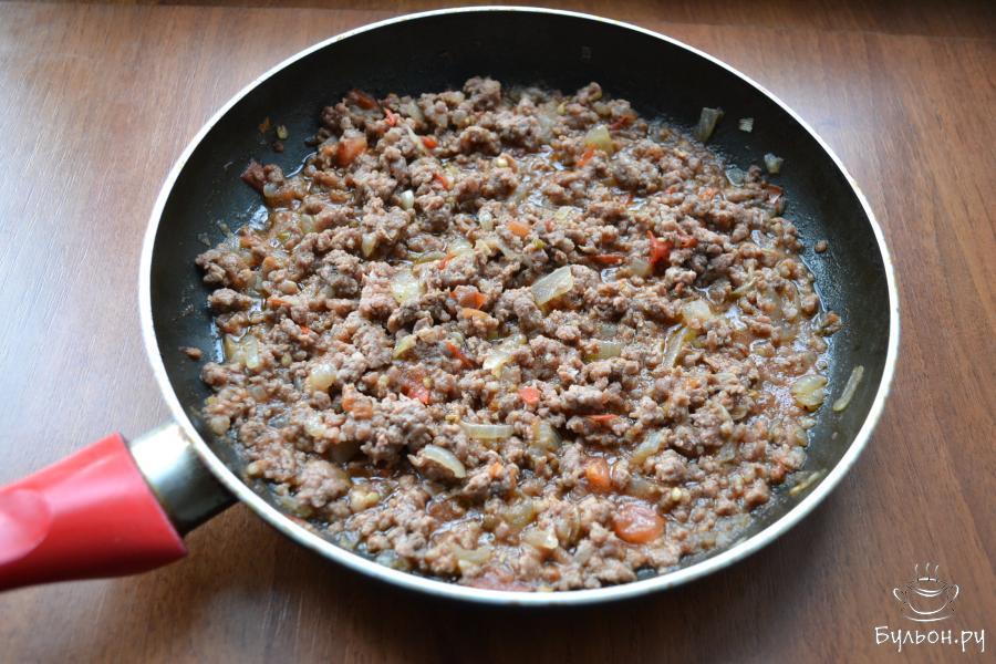 12. Сверху, на тесто, в центр, выложить обжаренный говяжий фарш. Подать азербайджанский хинкал, посыпав тертой брынзой и измельченной петрушкой. Приятного аппетита.