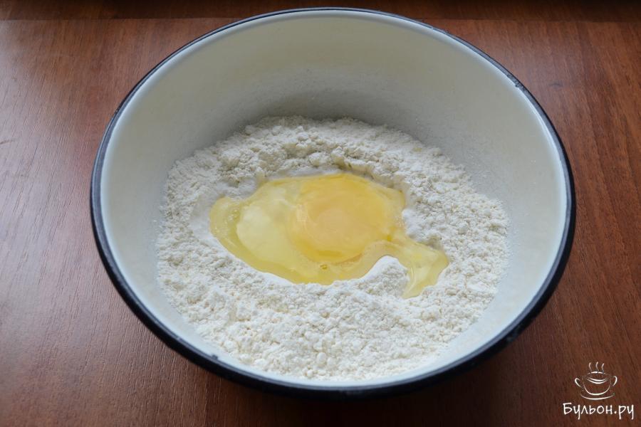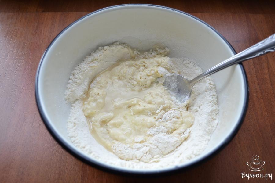 2. Влить половину воды, чуть перемешать ее с яйцом и далее замешивать тесто, доливая оставшуюся воду.