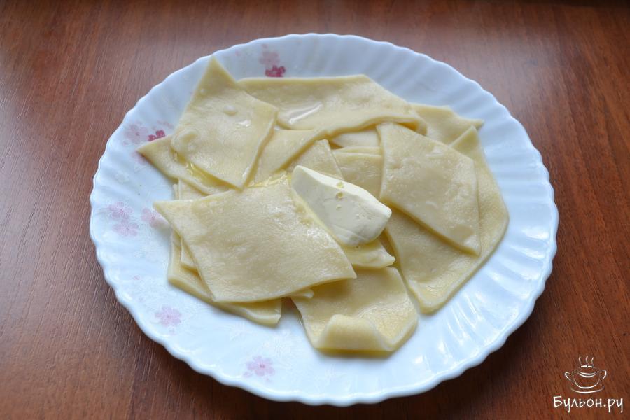 11. Кусочки теста выложить на большую плоскую тарелку, добавить оставшееся сливочное масло, перемешать.