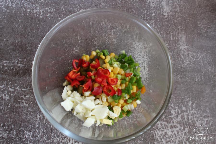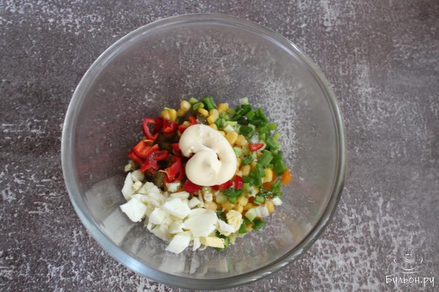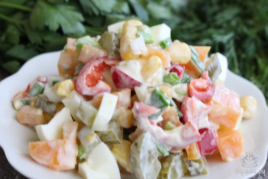 Яркий и сочный салат с кукурузой, сладким перцем и яйцом можно приготовить, как к повседневному, так и к новогоднему столу. Этот салат очень вкусный, нежный, все ингредиенты неожиданно и отлично сочетаются между собой и дополняют друг друга. Готовится такой салат быстро, его приготовление подойдет вам, если срочно нужно предложить блюдо к столу. При кажущейся простоте, этот салат красочный, аппетитный, он отлично подойдет для праздничного стола..
