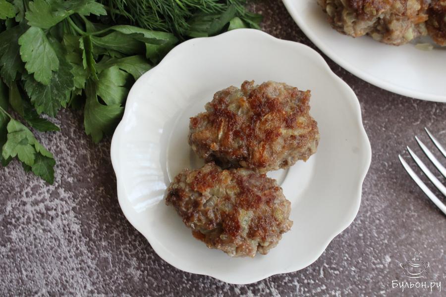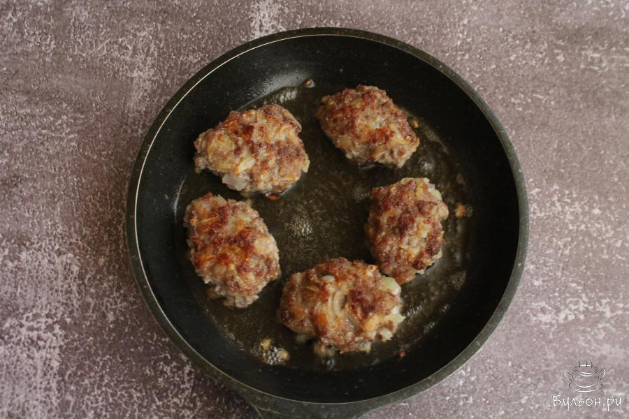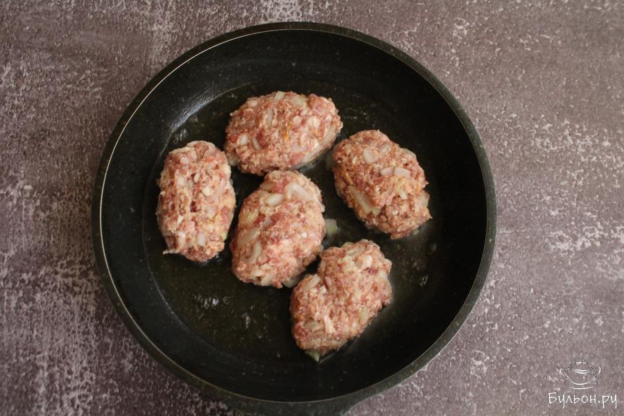 5. На сковороде разогреть масло. Руками сформировать котлеты нужного размера и жарить их с одной стороны до румяного цвета. Жарить котлеты на среднем огне.