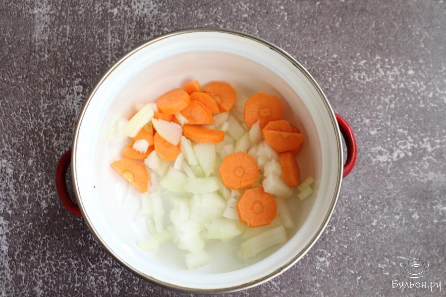 1. Овощи почистить и промыть. Лук нарезать мелко, а морковь кружочками. Выложить овощи в кастрюльку, влить воду и варить овощи 7-8 минут.