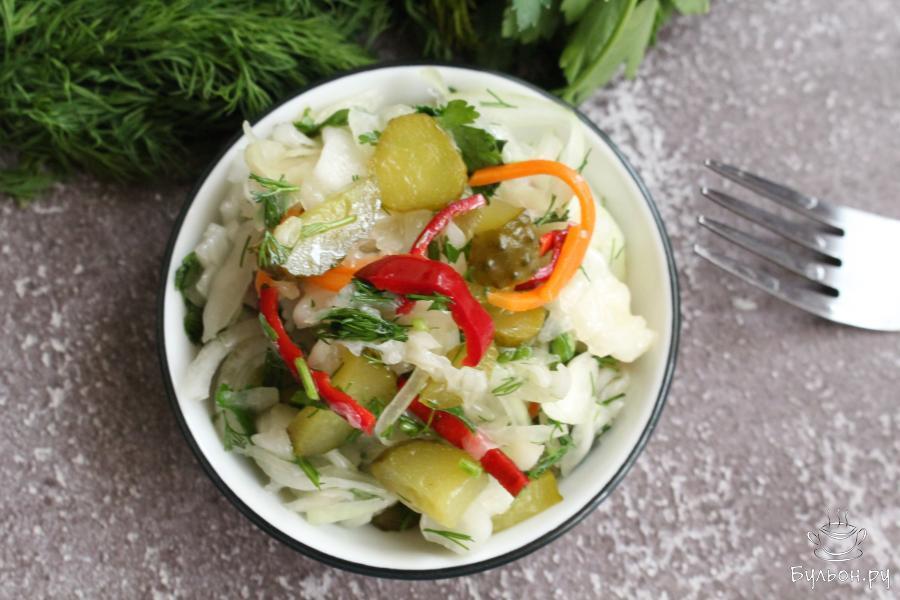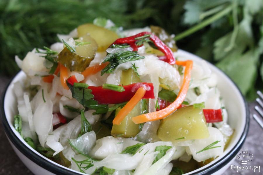 Постный салат из квашеной капусты с овощами отлично подойдет для праздничных дней, но когда уже обильное вечернее застолье пройдет. Потом, на следующий день самое время будет готовить этот салат. Квашеная капуста и вообще любые квашеные овощи и фрукты - это замечательный природные ферменты, которые помогают нам с пищеварением. Поэтому этот салат не только сочный, яркий и вкусный, еще он очень полезный. Одним словом он разгрузочный. И готовится за считанные минуты.
