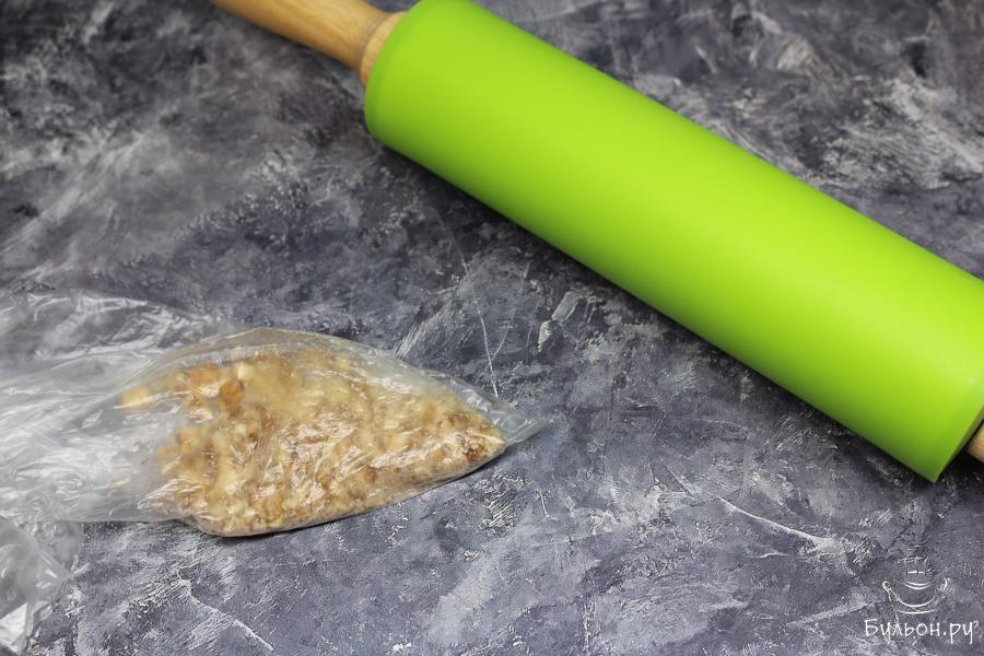 4. Измельчите любым способом орехи. Можете положить в пакет орехи, накрыть полотенцем и пройтись прямо по орехам скалкой несколько раз в одну, потом в другую сторону.