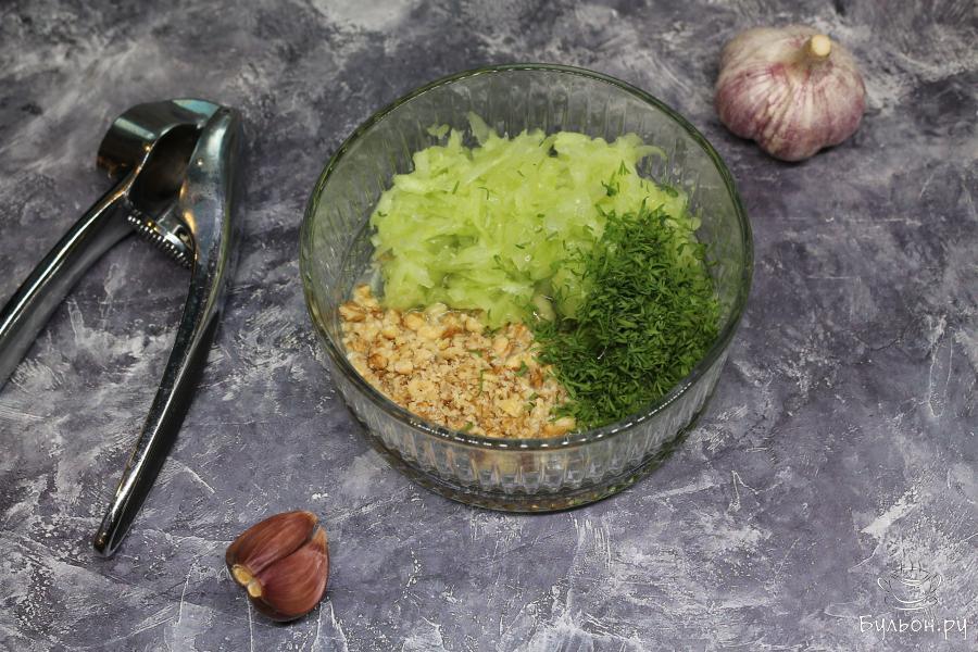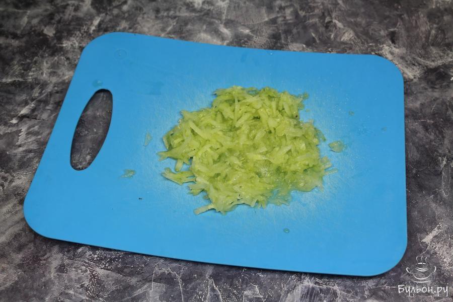 1. Огурец очистите с помощью овощечистки от кожицы. Натрите огурец на крупной терке, подсолите и отставьте в сторону на время.