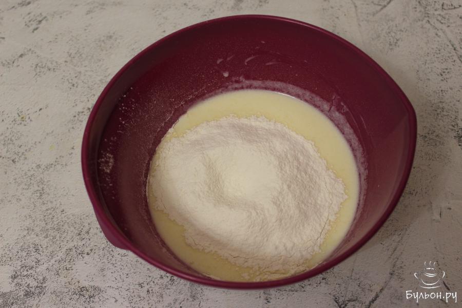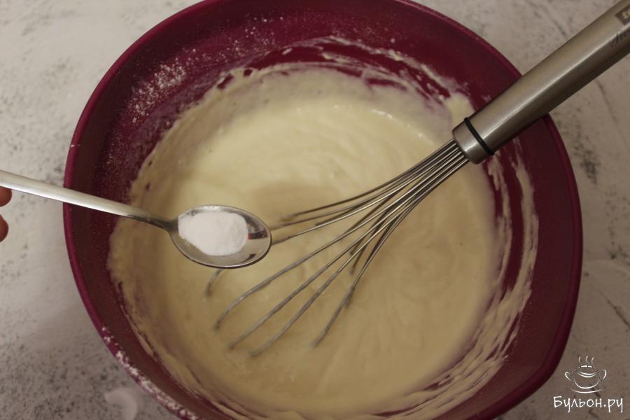 3. Всыпьте соду, перемешайте венчиков и дайте намного времени, чтобы сода начала работать. Уксус добавлять не надо, кислый кефир должен дать реакцию с содой.