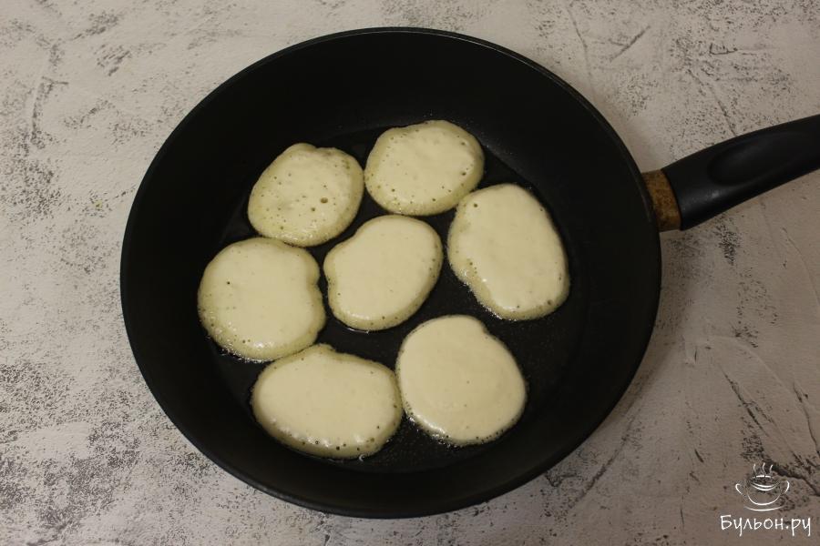 4. На сковороду влейте растительное масло и поставьте на огонь. Когда масло разогреется, выложите столовой ложкой оладьи. Обжарьте их с двух сторон до золотистого цвета.