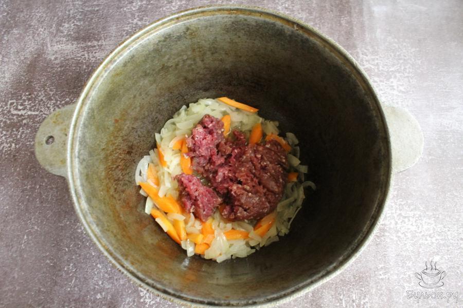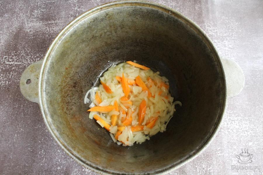 1. Овощи почистить и промыть. Лук нарезать мелко, морковь кубиками или кружочками. В казане разогреть масло и обжарить овощи до полумягкости.