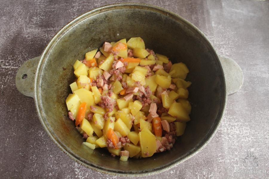 5. Накрыть казан крышкой, огонь уменьшить и готовить блюдо до мягкости картошки. Готовое блюдо перемешать.
