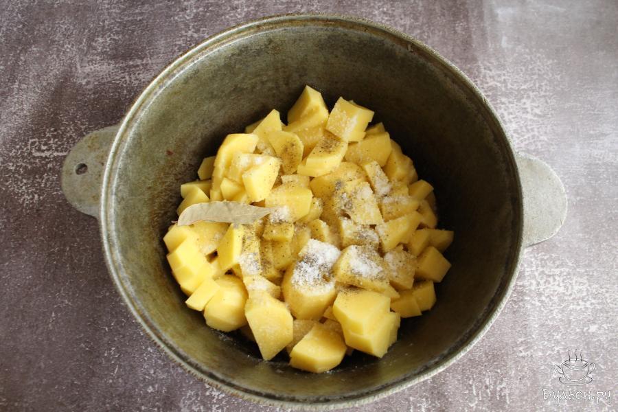 4. Картошку нарезать нетонко ломтиками или дольками, выложить в казан. Добавить соль, перец, лавровый лист и влить воду. Не перемешивать.