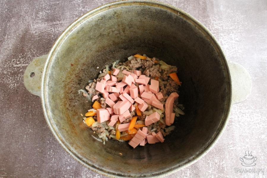 Тушеная картошка с фаршем и вареной колбасой - это простое, но очень вкусное и сытное блюдо. Такая тушеная картошка получается насыщенная, мягкая, ароматная и сочная. Блюдо можно предложить к обеду или ужину. Фарш для приготовления выбирайте любой, который вы обычно используете. Тушеную картошку можно приправить своими любимыми пряностями, добавить мелко нарезанную зелень. Это по желанию. Блюдо готовится просто и быстро.