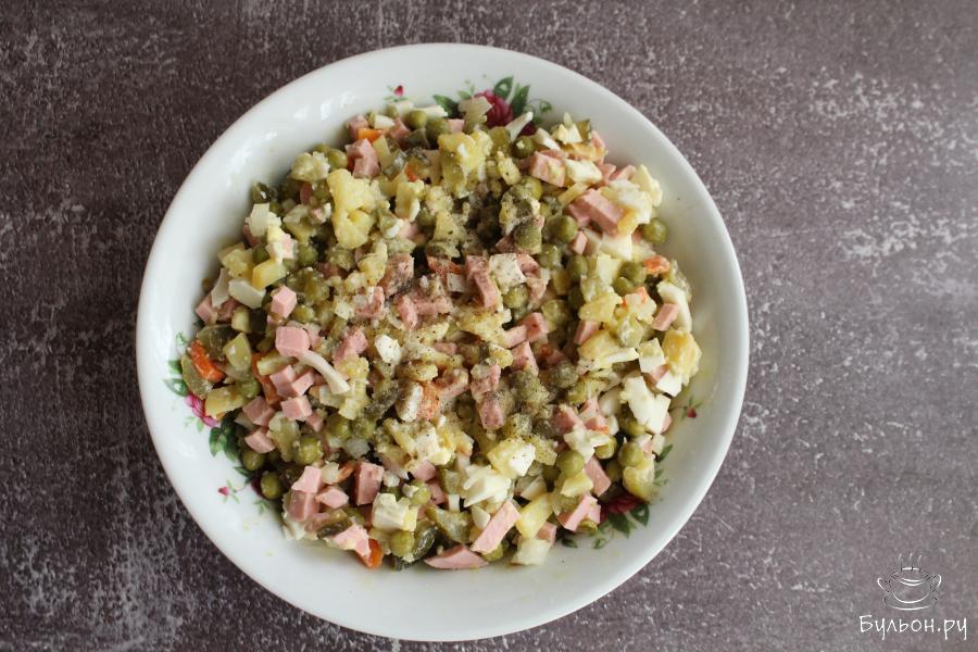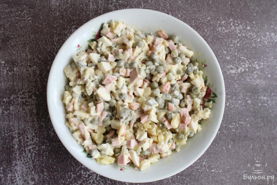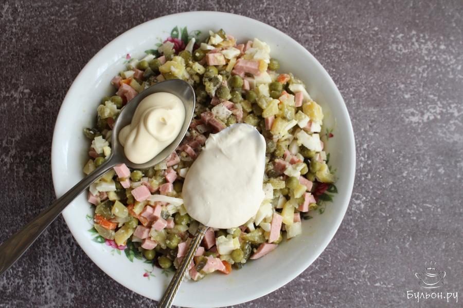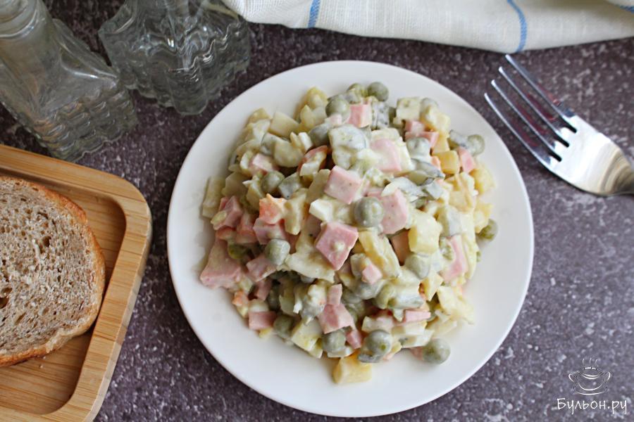 Этот салат знает наверное каждый, все его готовят со своими нюансами и секретами. Я сама его готовлю, то с вареным мясом, то добавлю яблочко. Классический советский салат "Оливье" с вареной колбасой по этому рецепту готовили еще мои бабушки. Особых секретов тут нет, разве что, мы никогда не заправляем весь салат, а заправляем нужное количество на данный момент. Не заправленный салат хранится дольше. И всегда этот салат заправляли, у меня дома, половина - майонеза, а половина - очень жирная сметана или каймак. Салат конечно очень каллорийный, но замечательно вкусный!