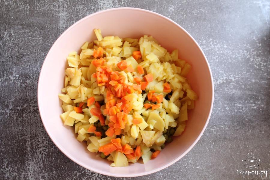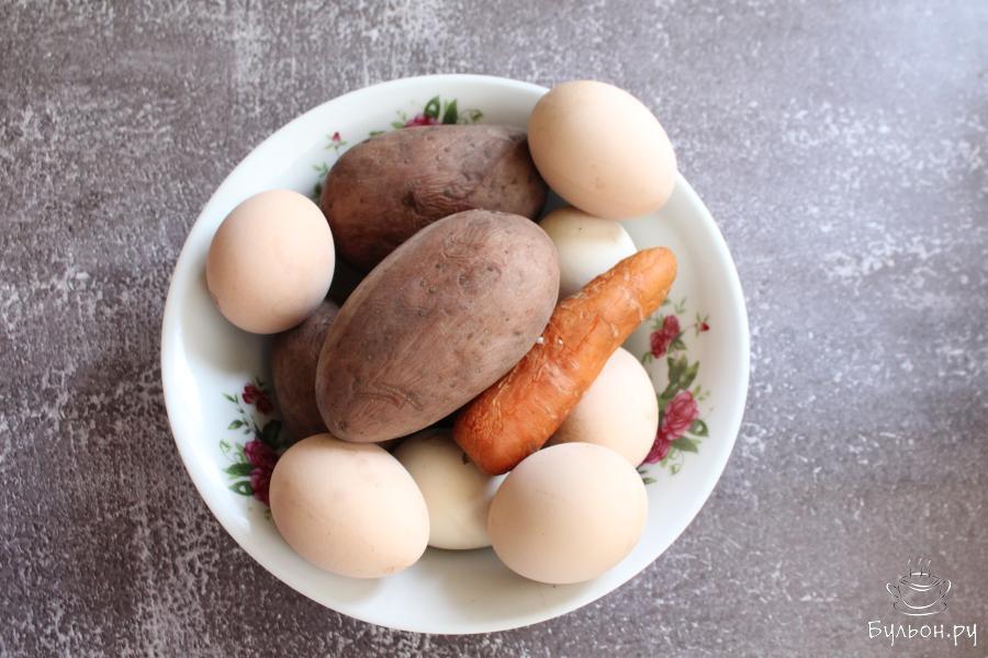 1. Сварить картошку, морковь и яйца. Яйца варить 10-12 минут, картошку 20-25 минут, морковь 30-35 минут. Остудить и почистить овощи и яйца.