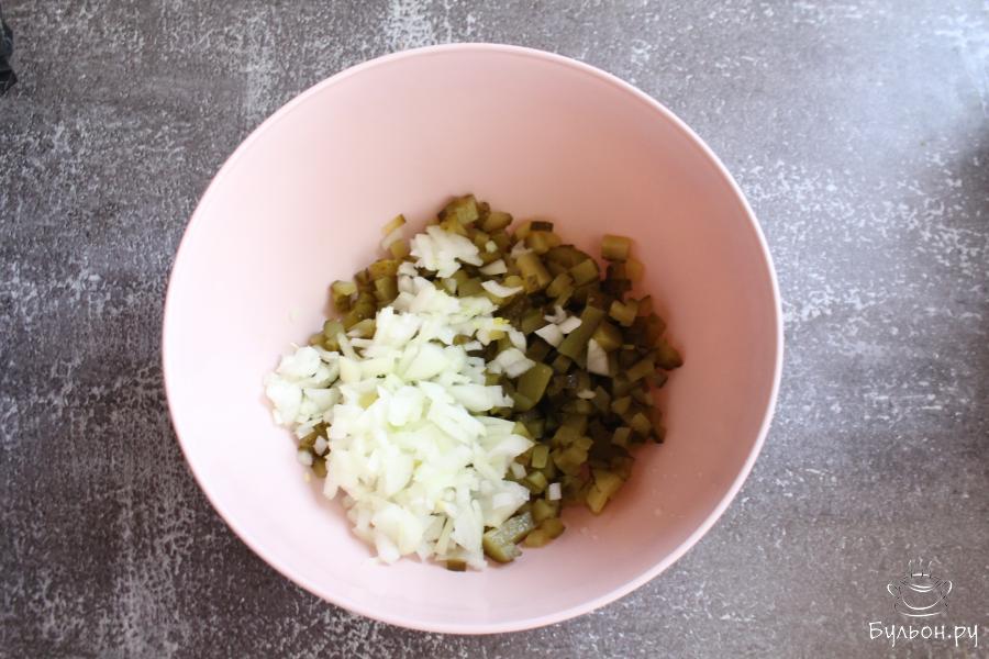 2. Лук почистить, промыть и нарезать очень мелкими кубиками. Огурцы нарезать мелкими кубиками. Выложить лук и огурцы в чашку.
