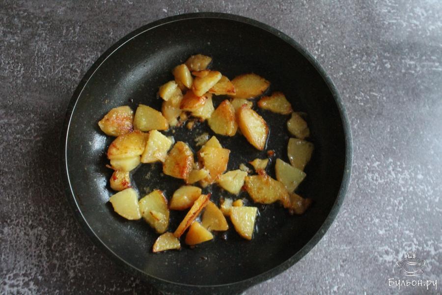 1. Картошку сварить до готовности, на это уйдет 20-25 минут. Картошку остудить, почистить и нарезать небольшими ломтиками. Обжарить картофель на сковороде с разогретым маслом до румяной корочки.