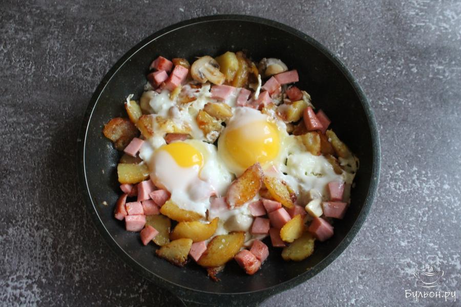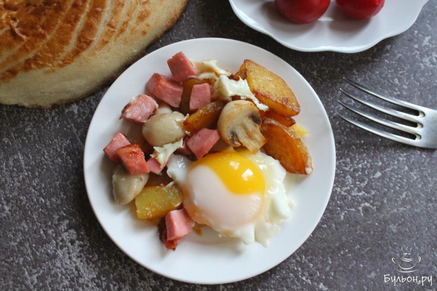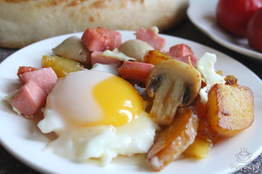 Если у вас осталась вареная картошка и вы думаете, куда ее использовать, приготовьте сытный завтрак по этому рецепту. Яичница с вареной картошкой, шампиньонами и колбасой получается сытная, насыщенная, вкусная и внешне аппетитная. Эта яичница насытит вас до обеденного приема пищи. Яичница готовится просто и достаточно быстро. Яичницу можно дополнить мелко нарезанной, любимой зеленью. А подать такой завтрак хорошо со свежими овощами или легким овощным салатом.