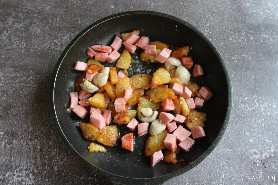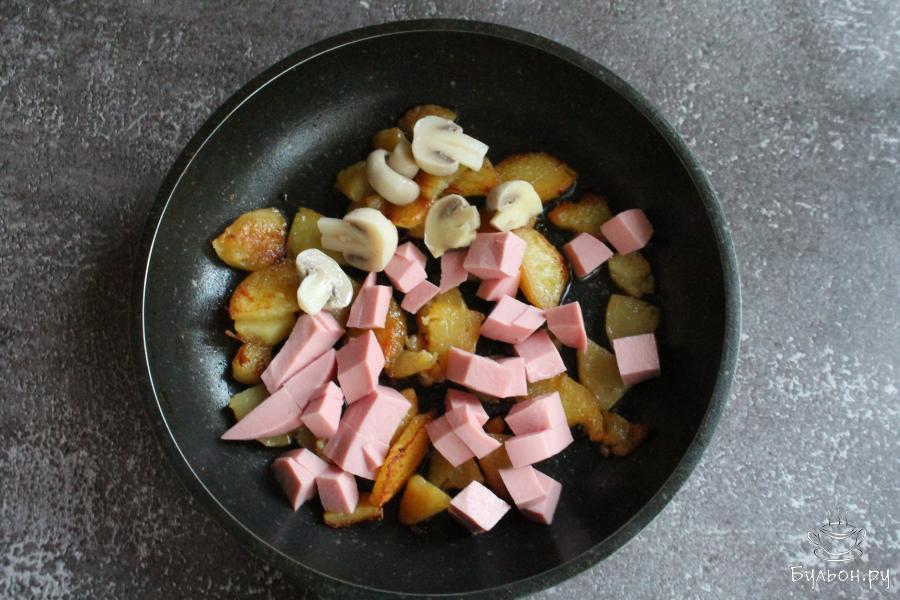 2. Маринованные шампиньоны разрезать на половинки, колбласу нарезать кубиками, обжарить все вместе минут 5-6. Помешивать.