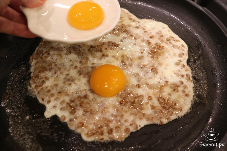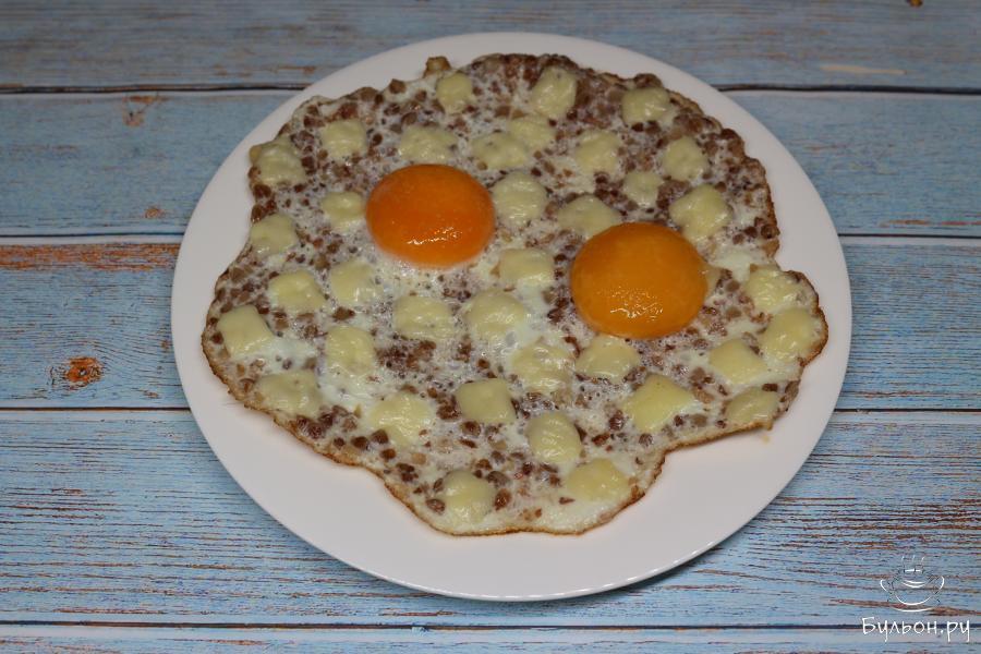 6. Готовую яичницу с гречкой и сыром переложите на тарелку. Лучше всего подать к ней что-то из овощей.