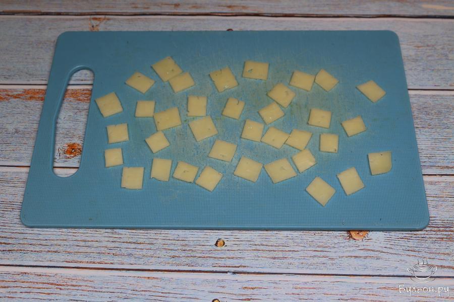 5. Влейте яичную массу на разогретую с маслом сковороду, аккуратно выложите сверху желтки. Сверху выложите сыр. Яичницу посолите.