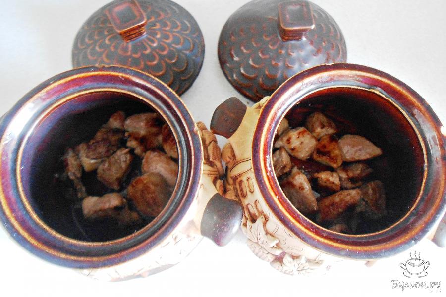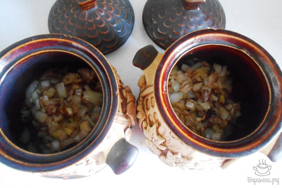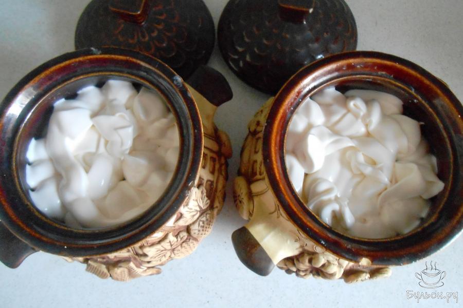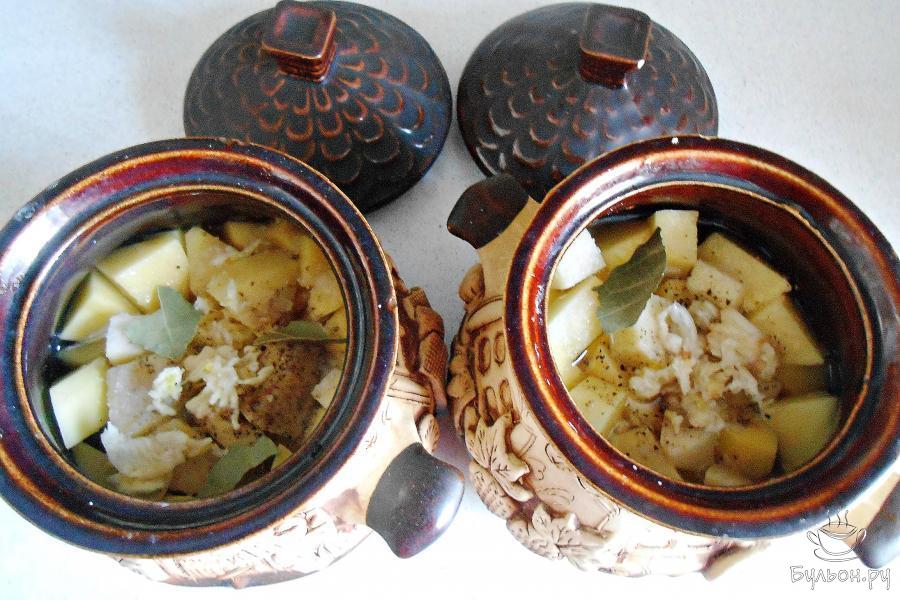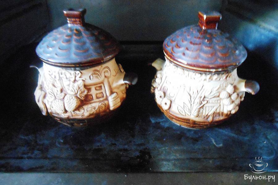 9. Налить в каждый горшочек по полстакана воды, добавить по одному лавровому листику, по 0,5 чайной ложки соли и перца, по 2 измельченных зубчика чеснока.
