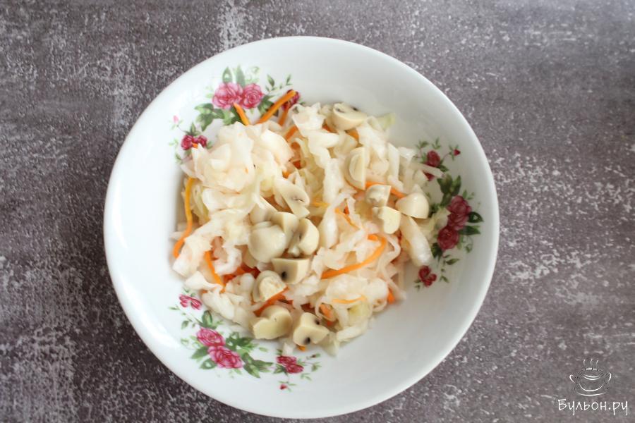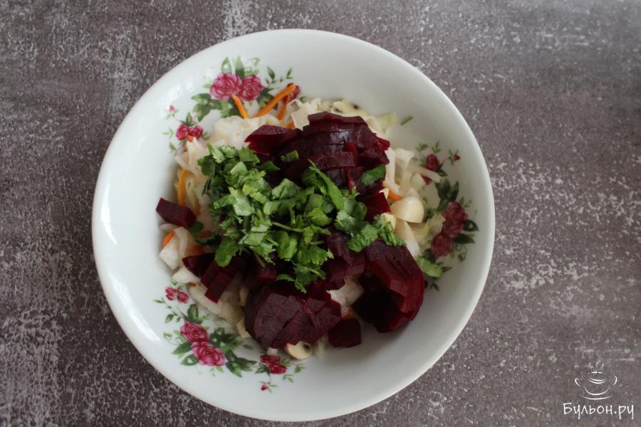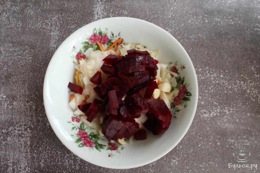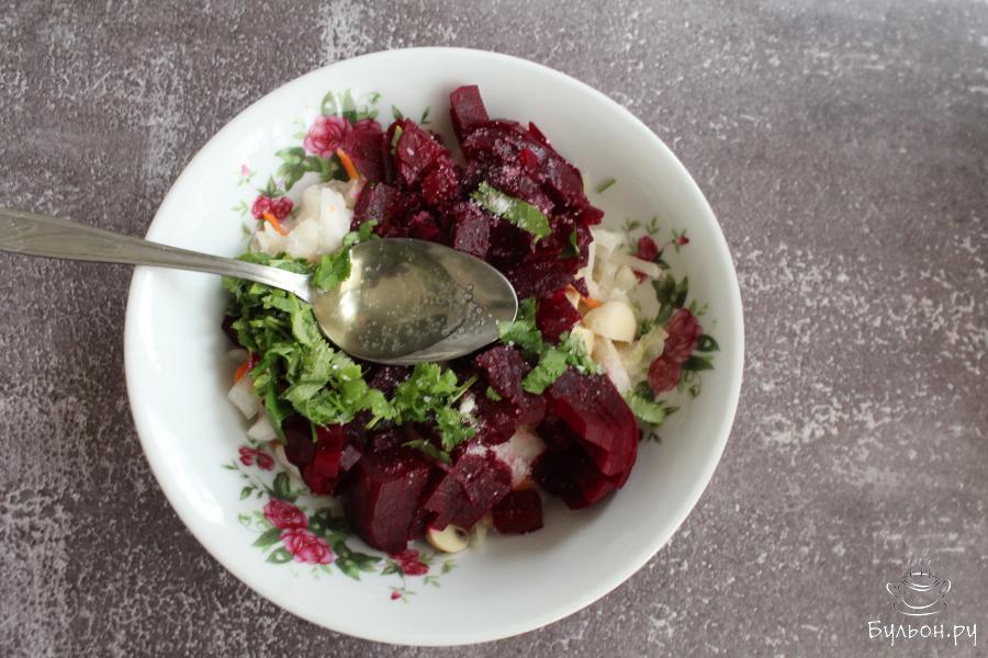 Салат из квашеной капусты с вареной свеклой и грибами можно подать к повседневному столу, а можно предложить такой салат вегетарианцам и постящимся. Салат получается легкий, сочный, хрустящий и полезный. Готовится такой салат очень просто и из доступных продуктов. Если отварить свеклу заранее, то на приготовление салата уйдут считанные минуты. Зелень для приготовления салата выбирайте ту, которую любите. Грибов можно добавить больше.