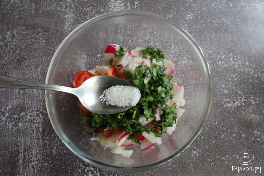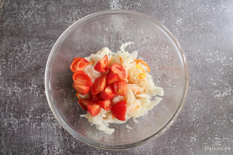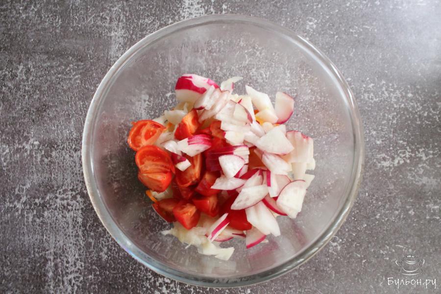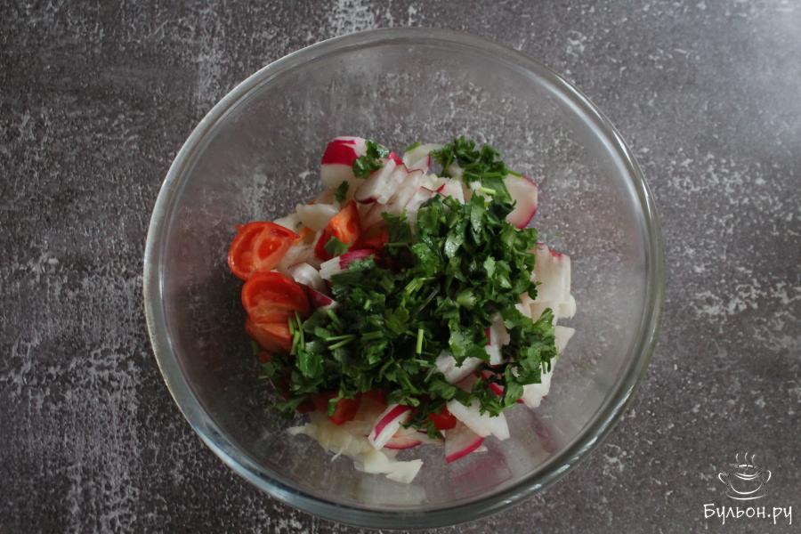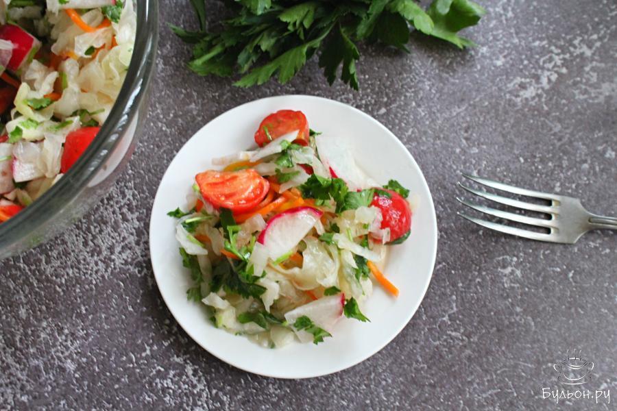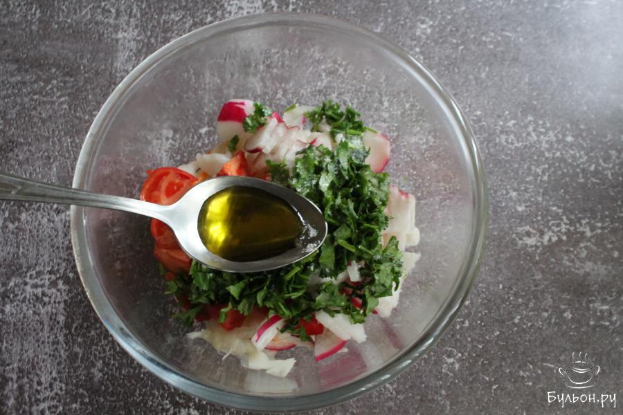 Салат из квашеной капусты с редиской и помидорами - это очень быстрое и простое в приготовлении блюдо. Такой салат подойдет как для повседневного, так и для постного и вегетарианского меню. Салат получается полезный, легкий, сочный и хрустящий. Помидоры для приготовления выбирайте небольшие, сладкие, зелень в салат добавьте ту, которую любите. Если вы не употребляете оливковое масло, то этот салат можно заправить любым, душистым, растительным маслом.
