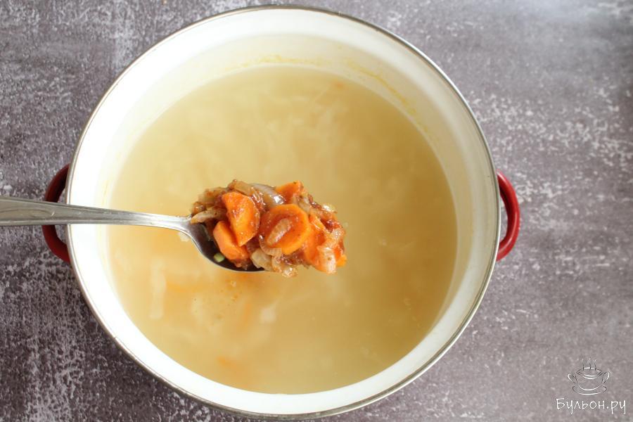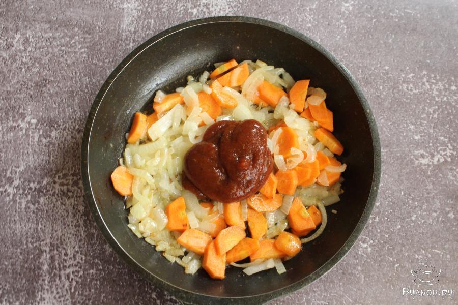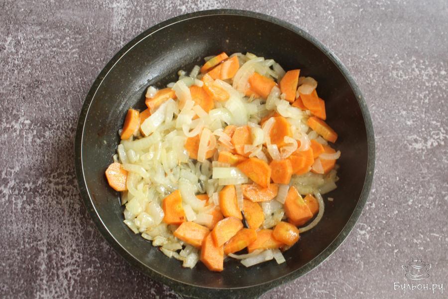 2. Овощи почистить и промыть. Лук нарезать мелко, морковь полукружочками. На сковороде разогреть масло и обжарить овощи, но не до сильной мягкости.