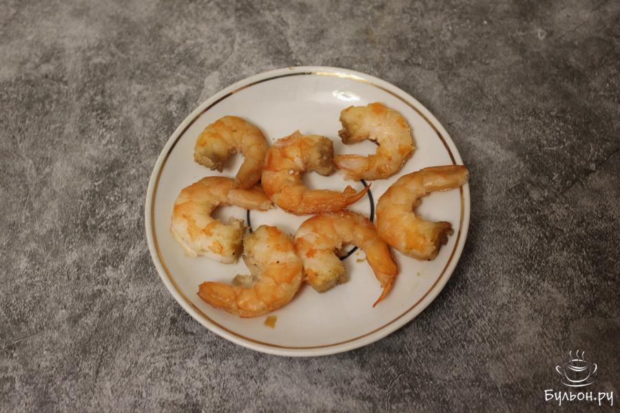 4. Очищенные креветки с удаленными кишечниками слегка обжарьте, смазав сковороду растительным маслом.